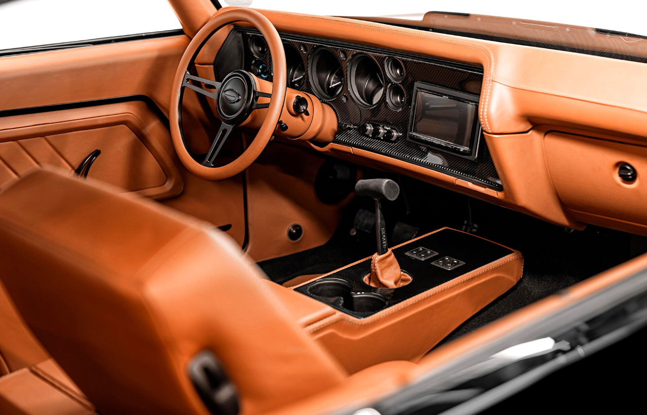 On the inside of the 2025 Chevy Chevelle, the leather seats, door panels, and dashboard now have a classic style and stitching to fit the retro theme. The speedometer, tachometer, fuel gauge, and other numbers are shown on a computer screen in the instrument panel. A touchscreen infotainment system in the center console works with Apple CarPlay and Android Auto. There is also a classic Hurst shifter with a cue-ball knob for cars with a manual transmission.